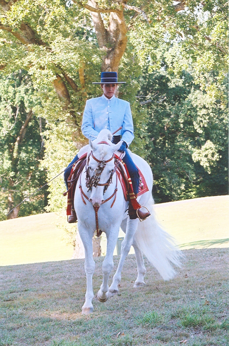 Laurence, qui est titulaire d’un monitorat depuis 1978 (BEES 1), a acheté Hélios à 3 ans. Je l’ai dressé avec l’aide d’un Bouglione (Monsieur Joaquin Alvarez, son nom de cirque !) J’ai fait pratiquement tous les salons en France: Paris, Lyon, Avignon, Montpellier….et bien d’autres prestations. A Paris je suis en photo dans le catalogue chaque année et j’ai eu la chance de passer deux « toutes petites fois » au Journal télévisé de 20 h sur TF1 . Toujours pour des présentations de dressage avec costume espagnol (aussi bien Hélios que moi même).