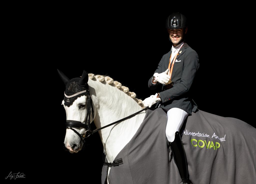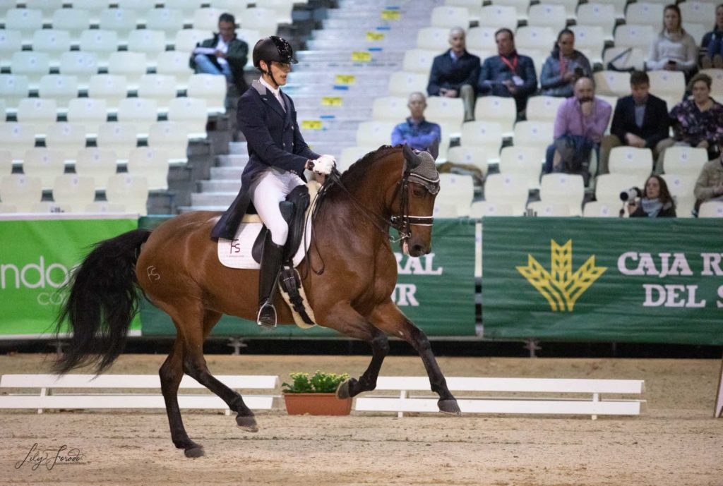 Luz FS, de la Yeguada Arroyomonte, a gagné une médaille d’argent, un deuxième rang avec une moyenne de 71,5%, sous la selle de Marco García . Elle est donc vice-championne du monde des PRE de 7 ans. Cette belle baie est une fille de Kabileño VIII, un des reproducteurs les plus importants de la Yeguada Marin Garcia. Le père de sa mère est le reproducteur d’élite Ermitaño III (Escalera).